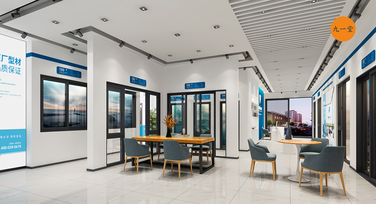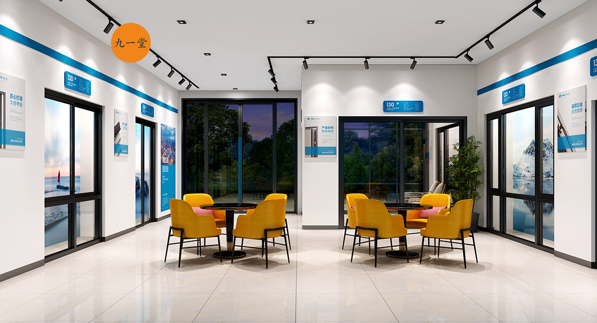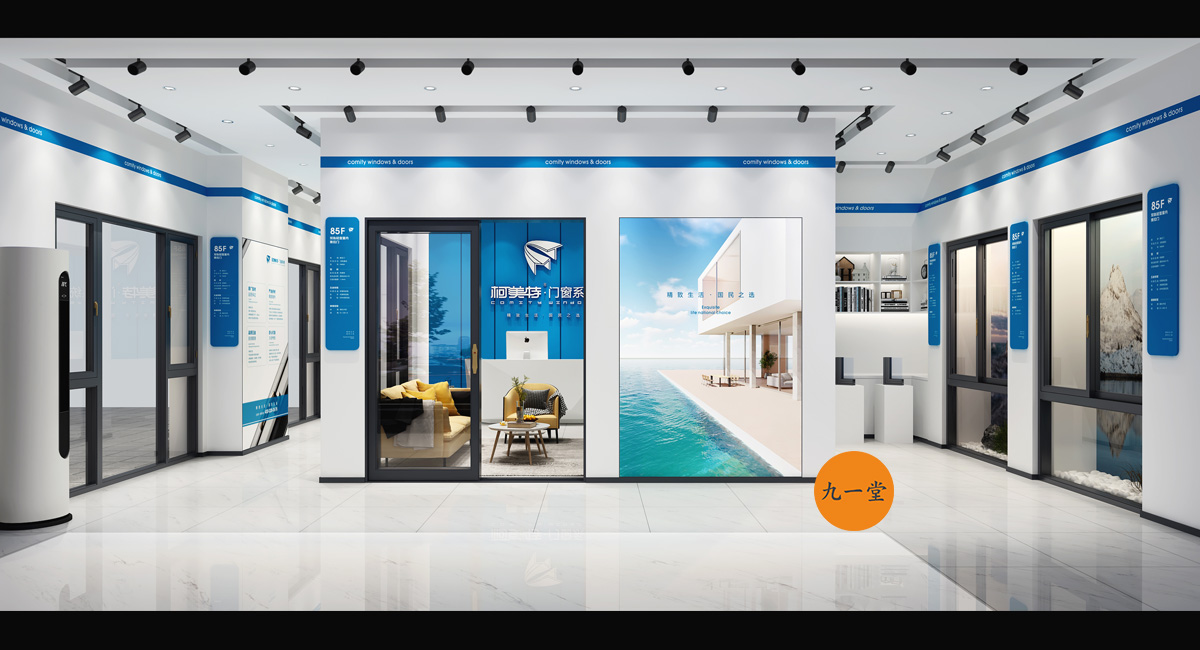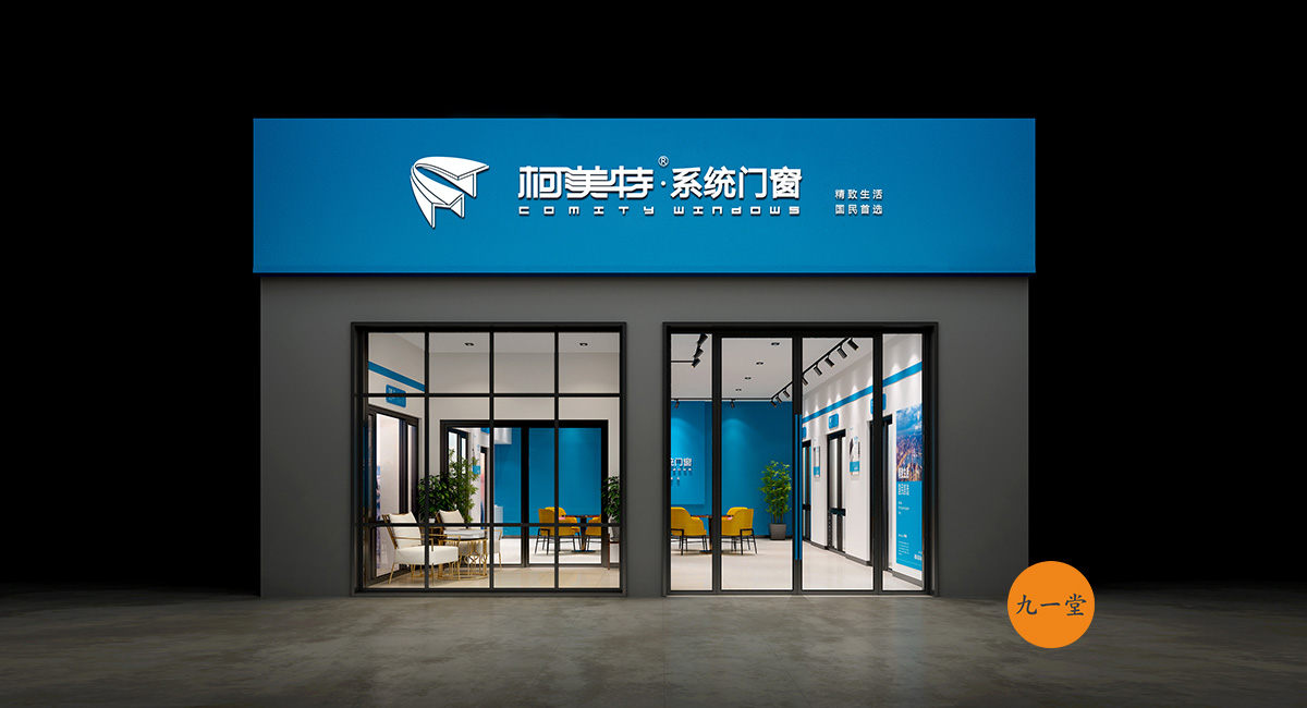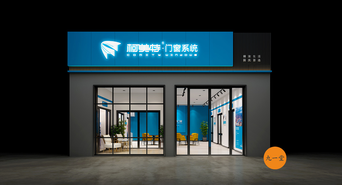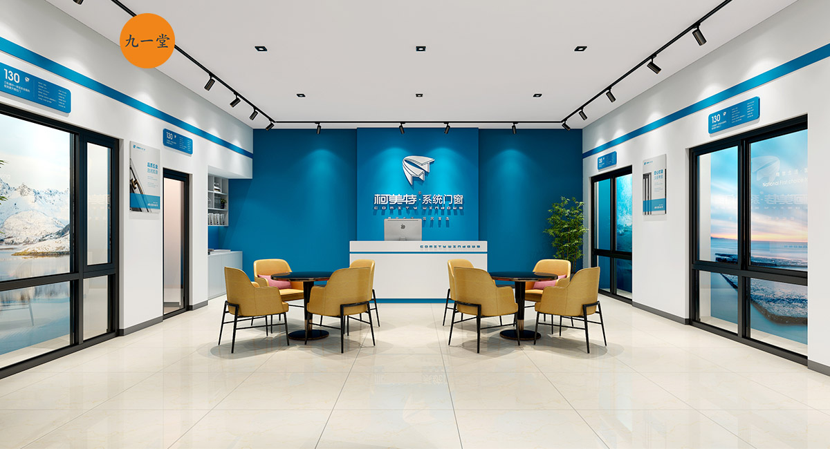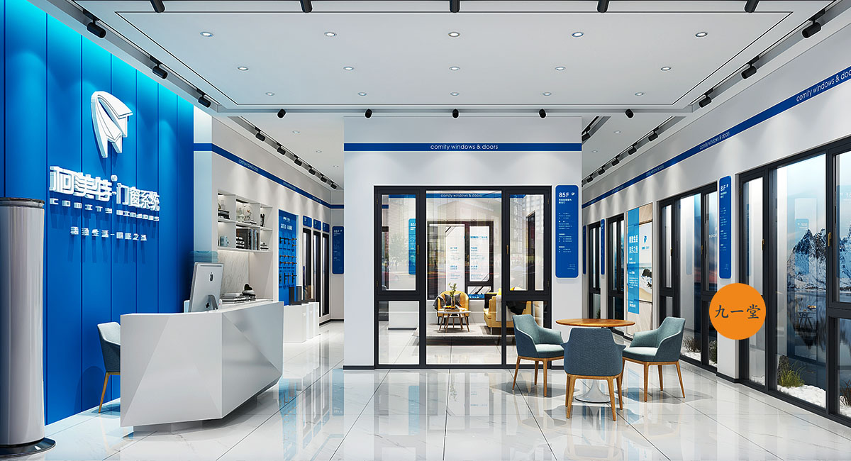 柯美特作為一家大型的建材集團,集成了研發,銷售,生產于一體門窗上市公司。生產基地在四川省眉山市丹棱工業園區,占地面積15萬平米。公司旗下有兩大門窗品牌,"貝瑟"和“柯美特”。旨在以多元化的產品滿足不同區域的市場需求,重新定義當代人家庭裝修需求。柯美特倡導精致生活理念,用心締造國民好門窗。此次,九一堂品牌以“精致生活,國民首選”為核心理念,對品牌進行了全新的策劃和店面升級。我們從四個方面重新詮釋柯美特品牌,“原廠型材 品質保證”“匠心打造 久經考驗”“嚴選好材 隔音隔熱”“品質五金 啟閉順滑”。商務空間的設計上為了呈現明亮、通透的視覺體驗效果,空間多以簡練玻璃門去體現,搭配上柯美特經典的藍色,整體空間體現出安靜,干練的品牌感受。最后空間上用暖色調的椅子去點綴,帶給消費者家居生活的舒適感。