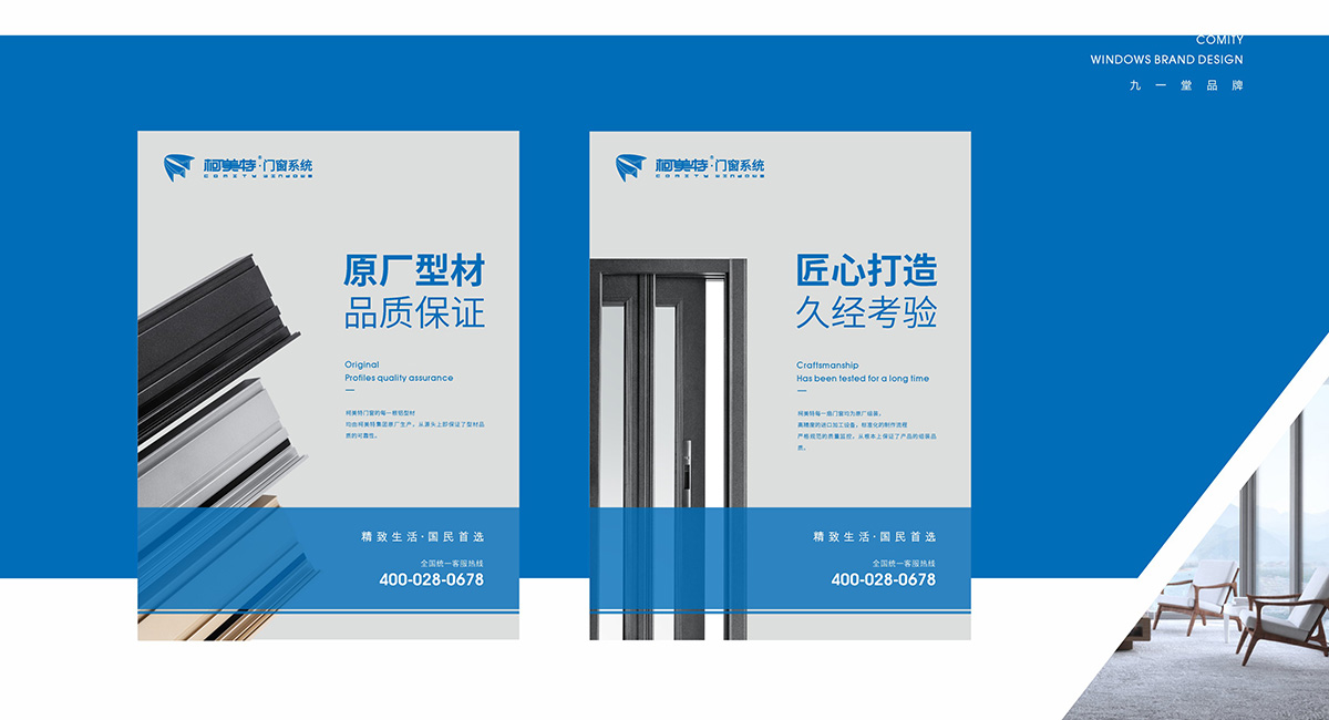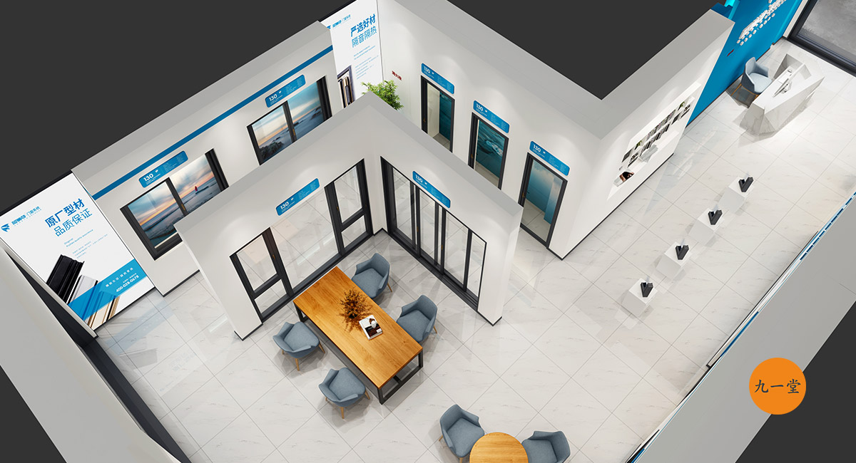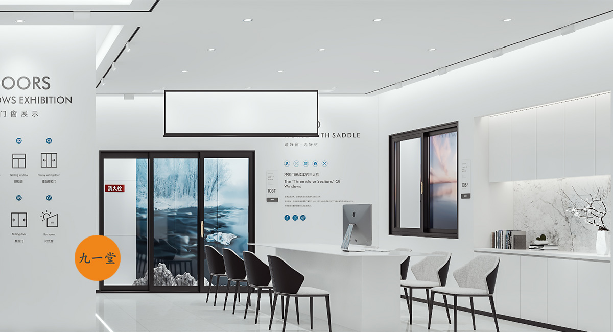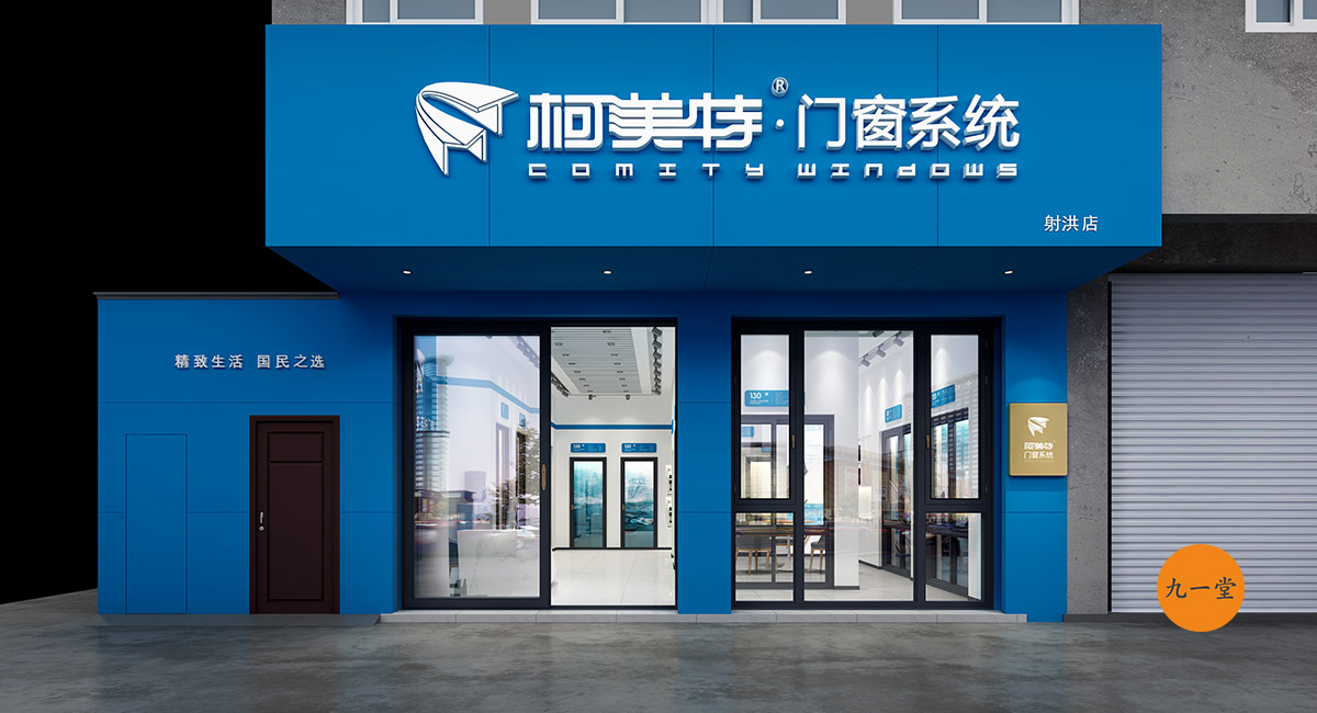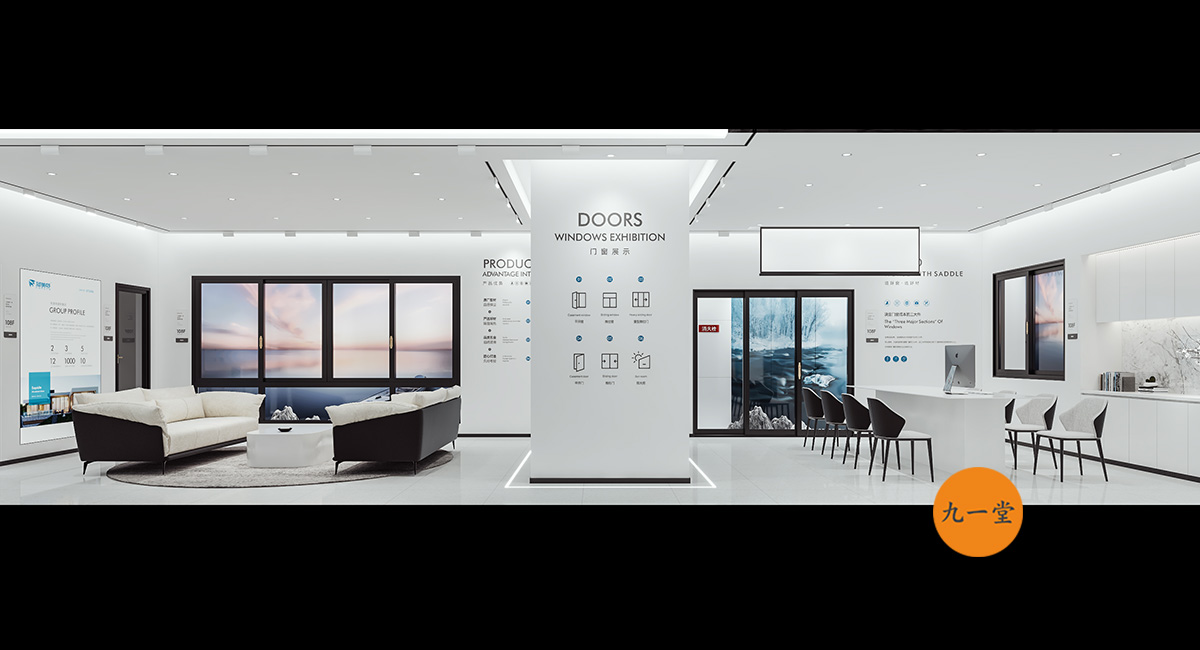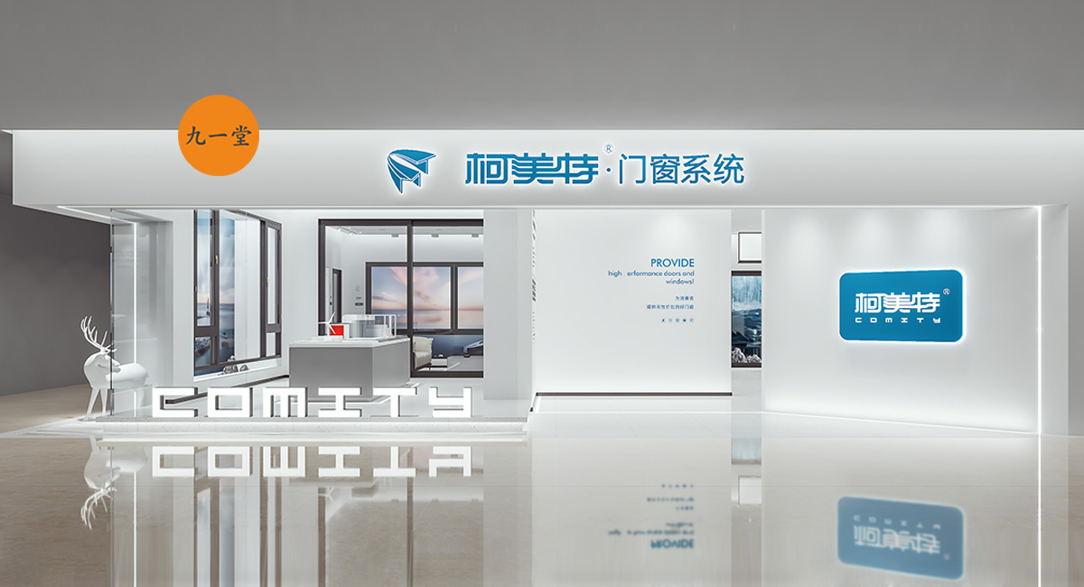 柯美特作為一家大型的建材集團,集成了研發,銷售,生產于一體門窗上市公司。生產基地在四川省眉山市丹棱工業園區,占地面積15萬平米。公司旗下有兩大門窗品牌,"貝瑟"和“柯美特”。旨在以多元化的產品滿足不同區域的市場需求,重新定義當代人家庭裝修需求。柯美特倡導精致生活理念,用心締造國民好門窗。此次,九一堂品牌以“精致生活,國民首選”為核心理念,對品牌進行了全新的策劃和店面升級。我們從四個方面重新詮釋柯美特品牌,“原廠型材 品質保證”“匠心打造 久經考驗”“嚴選好材 隔音隔熱”“品質五金 啟閉順滑”。商務空間的設計上為了呈現明亮、通透的視覺體驗效果,空間多以簡練玻璃門去體現,搭配上柯美特經典的藍色,整體空間體現出安靜,干練的品牌感受。最后空間上用暖色調的椅子去點綴,帶給消費者家居生活的舒適感。