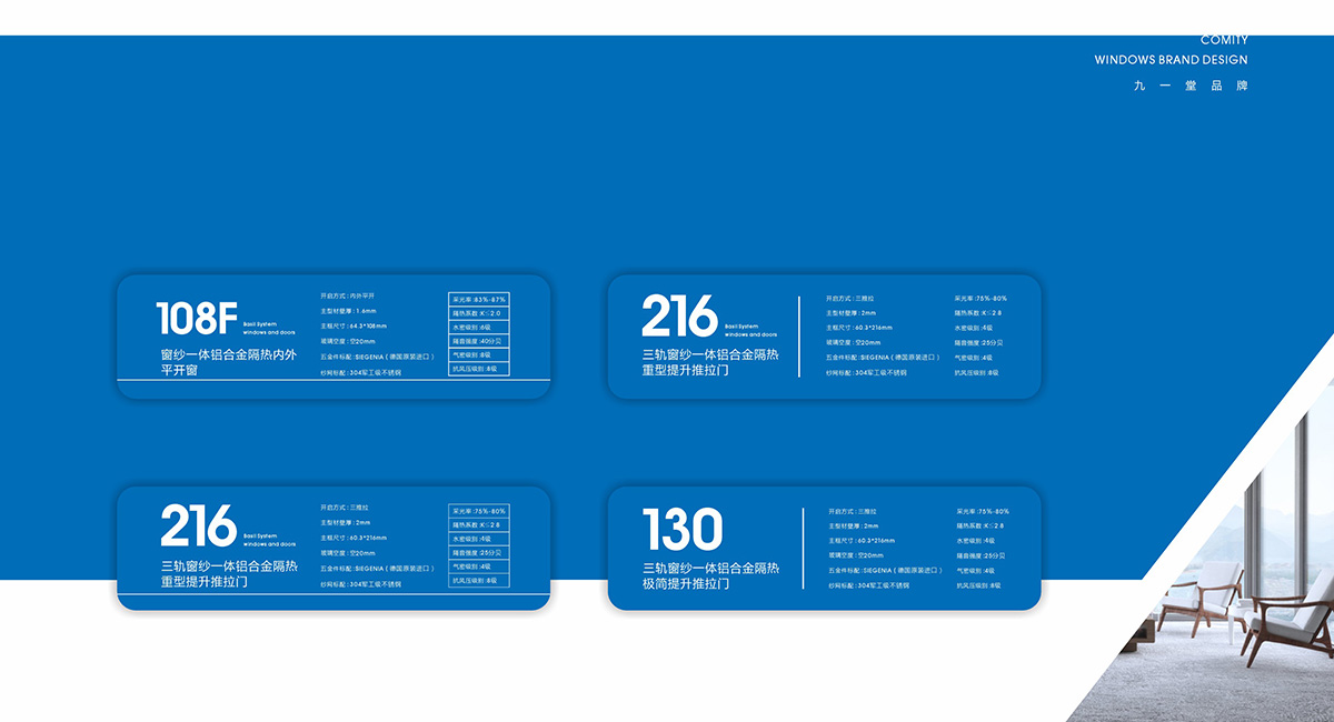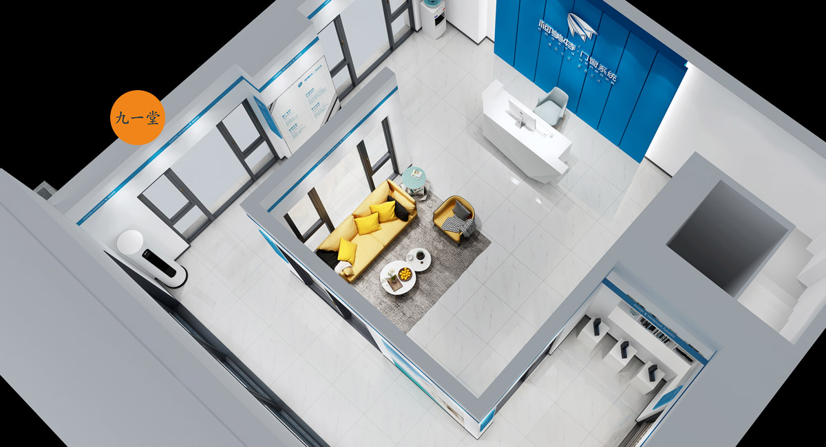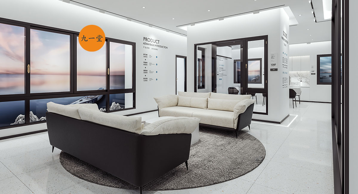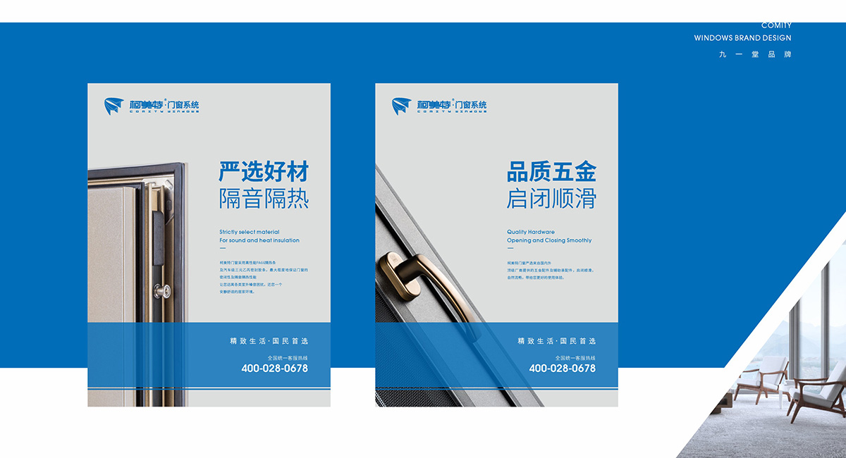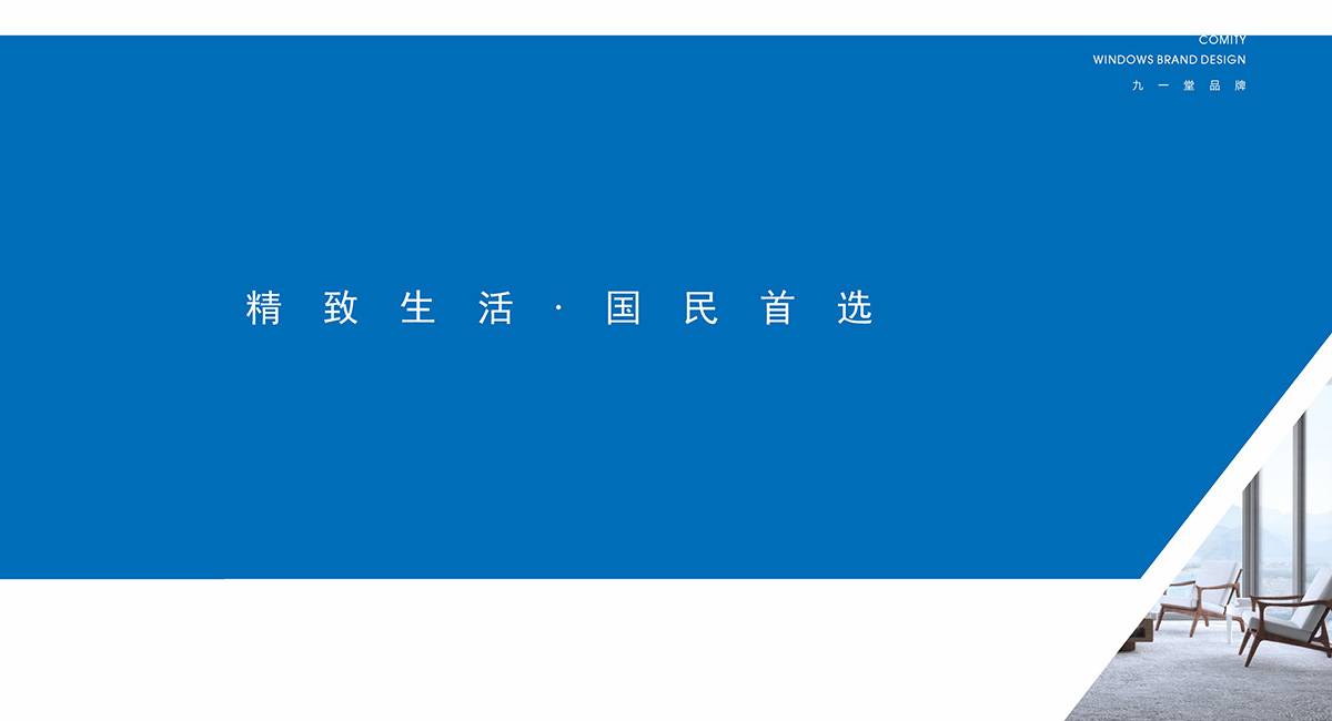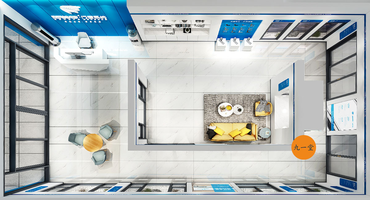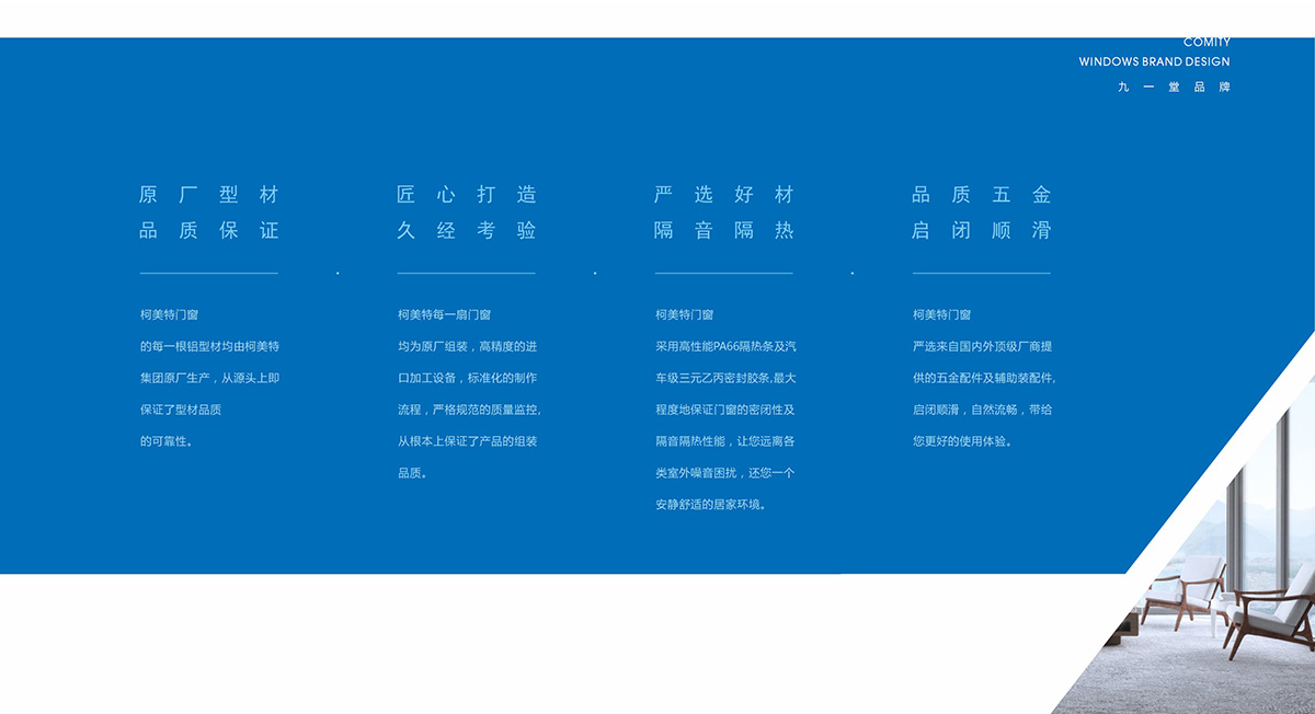 柯美特作為一家大型的建材集團,集成了研發,銷售,生產于一體門窗上市公司。生產基地在四川省眉山市丹棱工業園區,占地面積15萬平米。公司旗下有兩大門窗品牌,"貝瑟"和“柯美特”。旨在以多元化的產品滿足不同區域的市場需求,重新定義當代人家庭裝修需求。柯美特倡導精致生活理念,用心締造國民好門窗。此次,九一堂品牌以“精致生活,國民首選”為核心理念,對品牌進行了全新的策劃和店面升級。我們從四個方面重新詮釋柯美特品牌,“原廠型材 品質保證”“匠心打造 久經考驗”“嚴選好材 隔音隔熱”“品質五金 啟閉順滑”。商務空間的設計上為了呈現明亮、通透的視覺體驗效果,空間多以簡練玻璃門去體現,搭配上柯美特經典的藍色,整體空間體現出安靜,干練的品牌感受。最后空間上用暖色調的椅子去點綴,帶給消費者家居生活的舒適感。